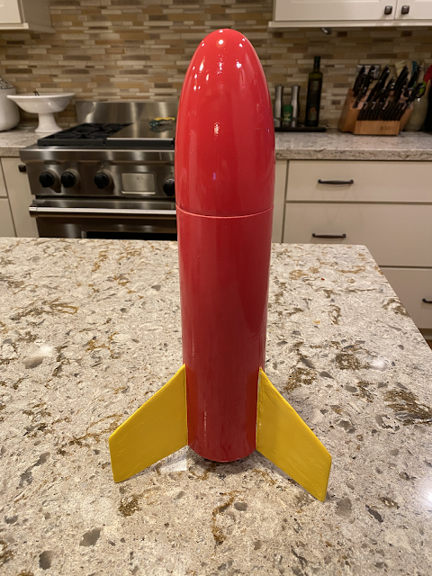I finished my DE' FatBoy in time for my first club launch. I painted the fins with Rust-Oleum Sunburst Yellow gloss enamel spray paint, taping off the body, waited eight or nine hours for it to dry then covered the fins with green Frog Tape and painted the body with Rust-Oleum Carnival Red gloss enamel spray paint. I'm really pleased it turned out almost as simulated above (minus the fake flames):
